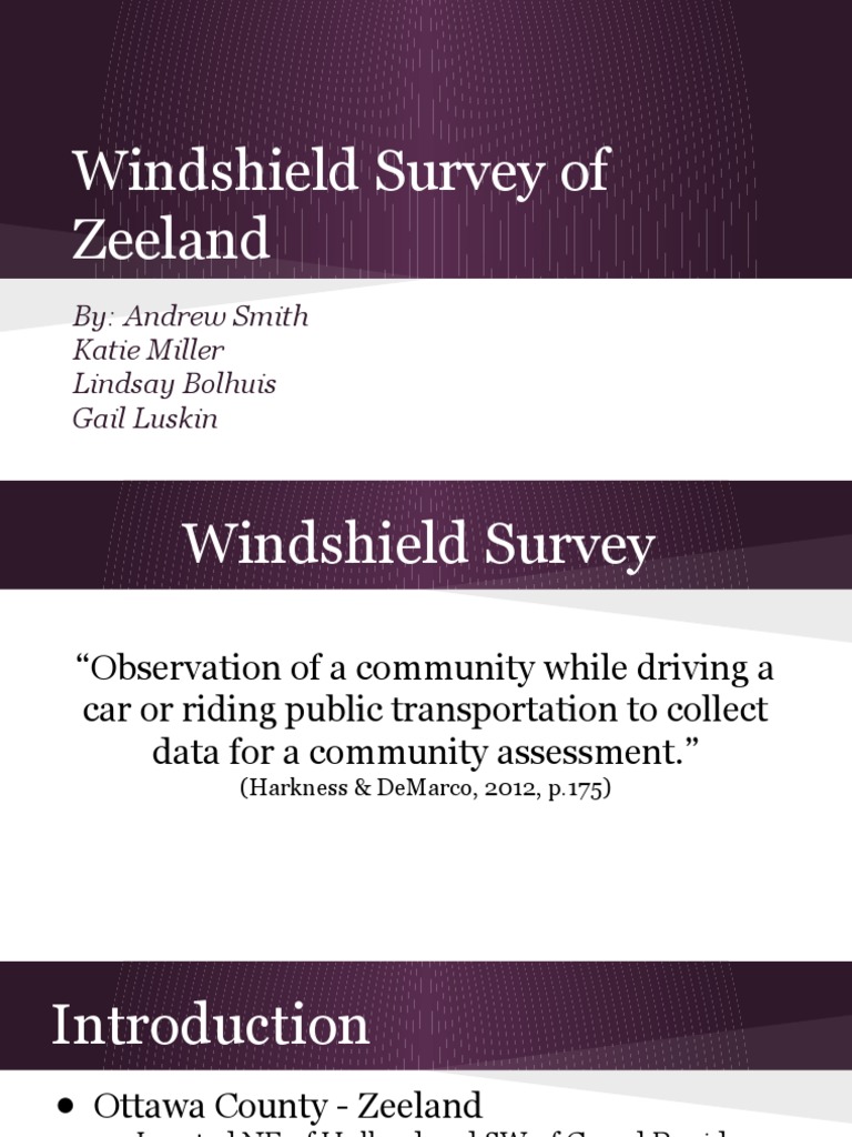 Windshield SurveyMichelle LewNURS 463. Windshield and walking surveys can be used to assess general community needs to estimate the poverty level for example or to examine more specific facets of the communitys physical social or economic character. Delphi Automotive Llp Denso.